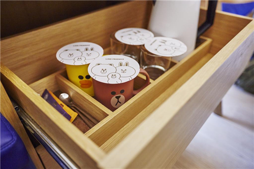 房间里所有的布置都印上品牌标识,目的是让入住的旅客们都被LINE FRIENDS包围着。