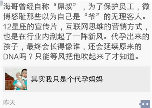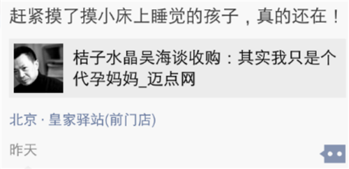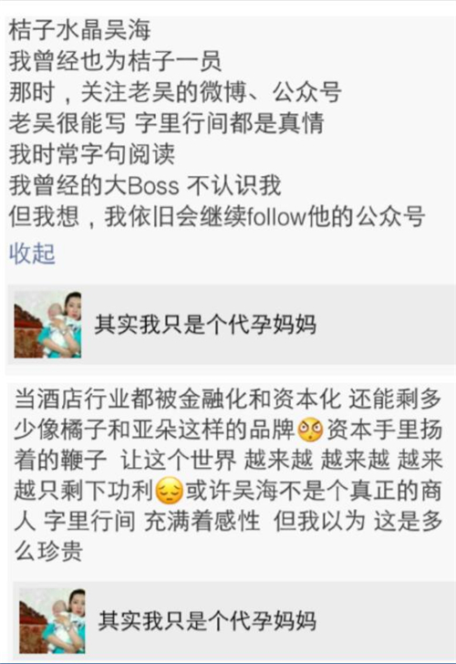 作为一方当事人,桔子水晶酒店集团CEO吴海紧随其后,在自己的官方微信公众号晒文《其实我只是个代孕妈妈》。此文一出,朋友圈各种感慨、情绪,喷涌而出。