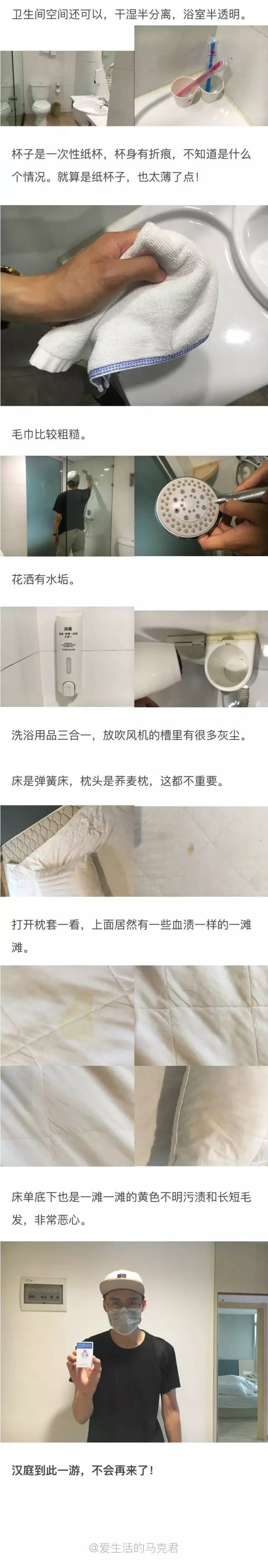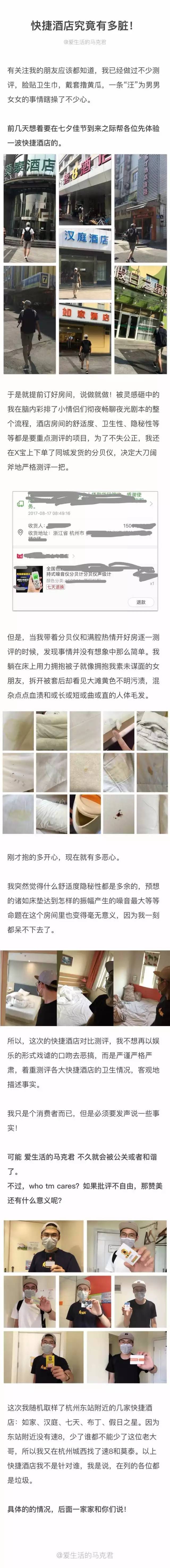 杭州网友@爱生活的马克君,在杭州随机取样了几家快捷酒店,对它们进行了设施、环境和卫生等实测。结果令人发毛…