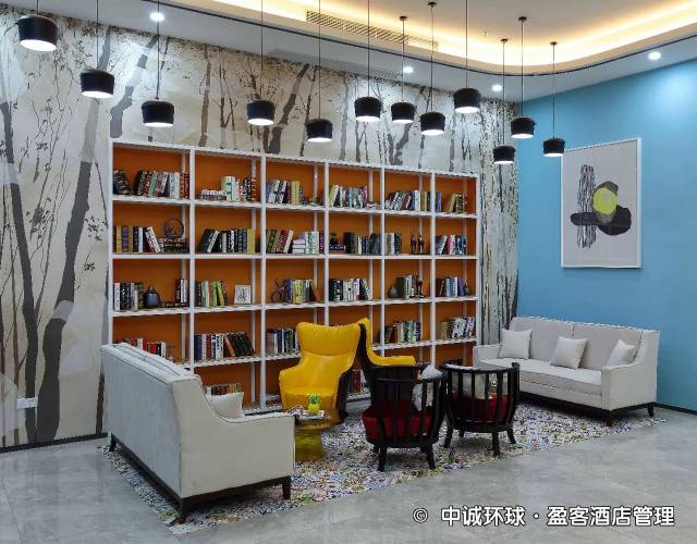 酒店大堂汇聚四季色彩为一体,看得出来在通过背景墙上的原木墩与休闲区地面的花砖融合,力在打造一个色彩斑斓又休闲时尚的大自然空间。书架和书本的存在,又为这个空间添加了些许文艺气息。