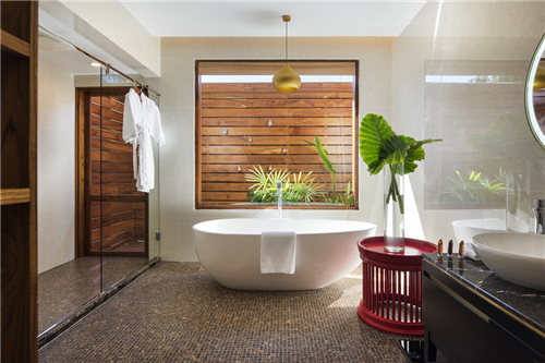 其中,田园别墅四周环绕着葱郁的花园和波光粼粼的池塘,采用暖色调设计,将灵感源自巴欧族妇女头巾的红色与橙色格纹巧妙融入天然编织材质之中,别具一格。沼泽地别墅临近水滨,采用灵感源自当地吊脚楼的四柱床,覆以绿色编织面料,令人联想到当地巴东族妇女的服饰。湖滨别墅坐拥怡人湖畔,从当地男子所着罗衣(帕索色织棉布)的蓝色格纹中汲取灵感。