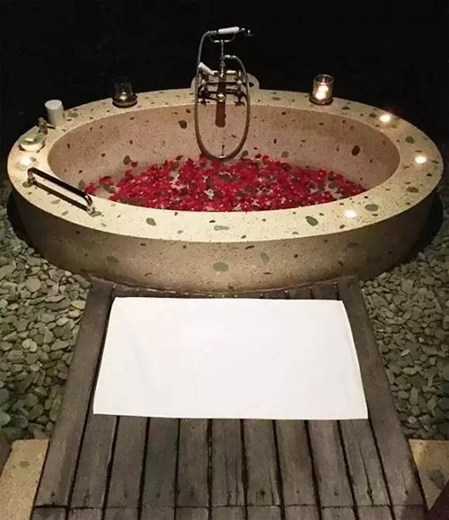 酒店布置好的烛台和花瓣浴。比起很多酒店的蜜月布置什么床单布折叠一个动物造型+用花瓣摆个爱心造型,是不是有着天差地别的感受。