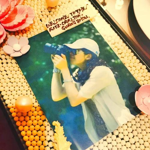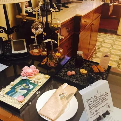 厨房团队也为了Annie准备了个性化的入住礼遇。厨师们以Annie最喜欢的照片为蓝图,打造了独一无二的精美蛋糕,蛋糕表面是用白色朱古力做成珍珠点缀的相框,配上粉色栩栩如生的巧克力花朵, 令人爱不释手。