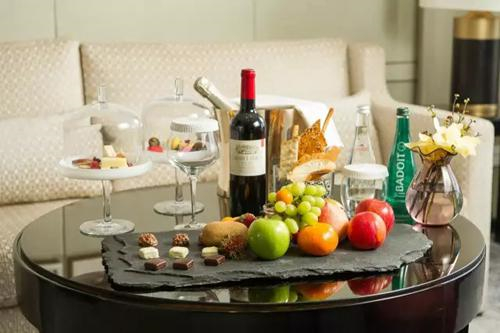 入住豪华套房的客人一开门就看到这么一大桌的欢迎礼是不是会感到好意外,各种水果、甜点、面包再加上红酒,足量可以举办一个小派对了,酒店果然是大气。