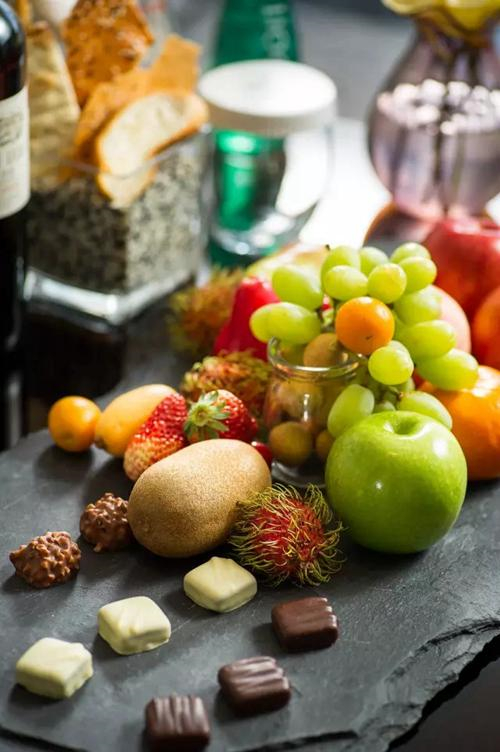 而丰盛的欢迎礼品除了新鲜的当季水果,缤纷饮品外,还有来自酒店巧克力工坊——珍藏坊的精致手工巧克力。可是纯手工精制的哦,用心的甜点师傅制作的每颗都不一样哦!