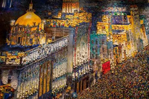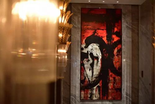 位于酒店前台黄来铎《夜外滩》,通过肌理油画的表现手法和暗绘的风格集中体现了上海外滩的灯红酒绿,也复原了上海二三十年代最辉煌的夜晚。