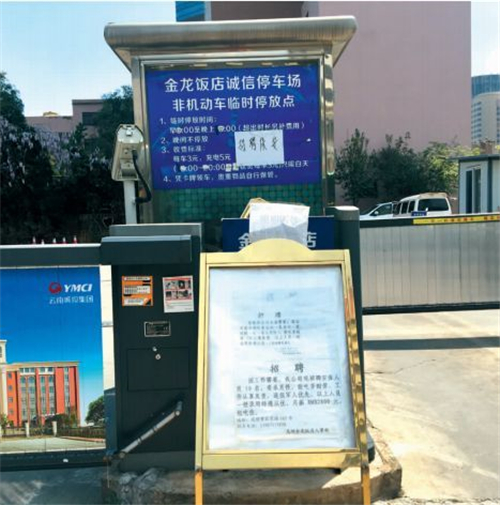 “因工作需要,我公司现招聘安保人员10名,要求男性……”在金龙饭店门口停车场的出入口处,记者看到了饭店人事部招聘保安的信息。招聘信息的发布是否意味着金龙饭店即将重新开业?停车场保安人员表示不知情。