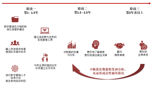 进过以上内容分享,相信大家一定对如何着手去搭建数字营销团队以及策略有了一定想法,在最后,笔者还希望能够提醒管理者们,成功的数字营销策略并非一蹴而就,管理者应制定3-5年的发展计划,从基础开始稳扎稳打,进行数字营销团队和策略的搭建,以下图示和思路,可供参考。