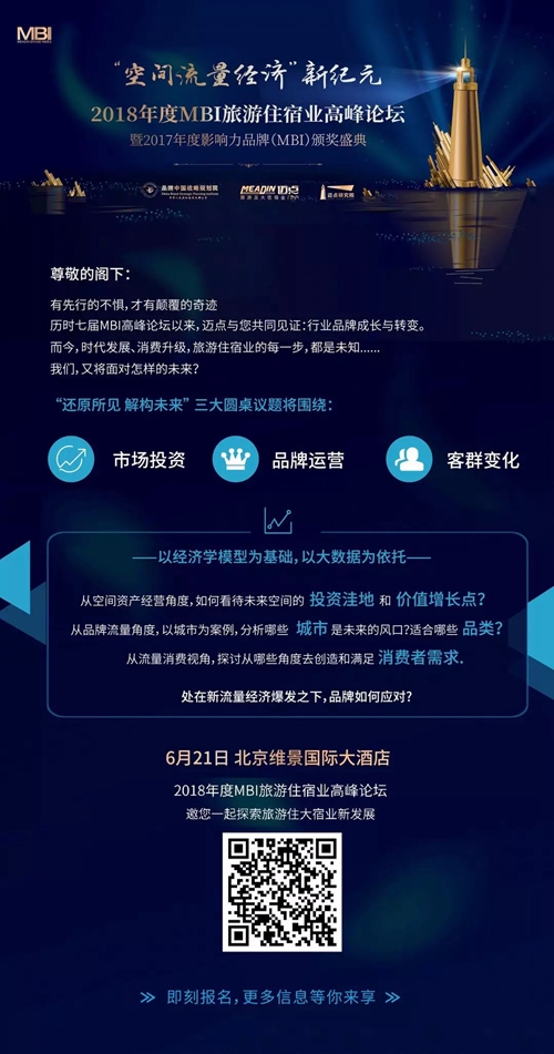 “空间流量经济”2018年度MBI旅游住宿业高峰论坛,依托迈点研究院年度行业白皮书,对话行业新经济,聚焦专家与领袖视角,探讨行业投资、品牌及客群新趋势,解构流量经济新模型,探索旅游住大宿业新发展,助力品牌增长。