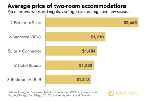 从Suiteness数据来看美国9个城市的平均值,Connector 套房往往是传统两居室套房价格的一半,即两个周末晚上均价为1484美元VS 2665美元。它们更接近一个Airbnb两居室的花费(1312美元)或者VRBO(1717美元)的物业成本,并且可以直接与这些选项竞争。传统套房往往比其他任何一种都贵得多。