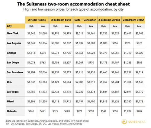 在这些比较中的一个关键的信息是,有两种不同类型的酒店套房,价格往往是非常不同的。第一种类型是传统套房,其中有一个入口门进入生活区,其中有卧室(通常是两个),就像我们家庭住房布局一样。第二种类型,称为连接套间,有点实用性——带着起居室的传统套房、直接连接1-2个标准间的卧室,每个房间都有通向起居室的门。