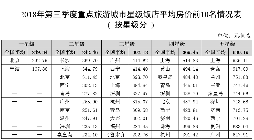 从第三季度各城市经营情况看,平均房价高于全国平均水平341.76元/间夜的有28个城市,位居前10位的分别为上海、广州、三亚、深圳、青岛、北京、厦门、南京、杭州、苏州,其中上海的平均房价最高,为706.48元/间夜。