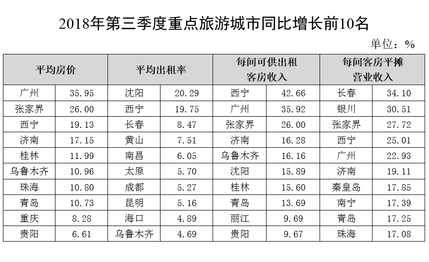 每间可供出租客房收入:增幅位居前10位的城市分别是西宁、广州、张家界、济南、乌鲁木齐、沈阳、桂林、青岛、丽江、贵阳,其中西宁增幅最大,增幅为42.66%;降幅位居前10位的城市分别是宜昌、北京、银川、三亚、福州、温州、洛阳、兰州、哈尔滨、长沙,其中宜昌降幅最大,降幅为16.59%。