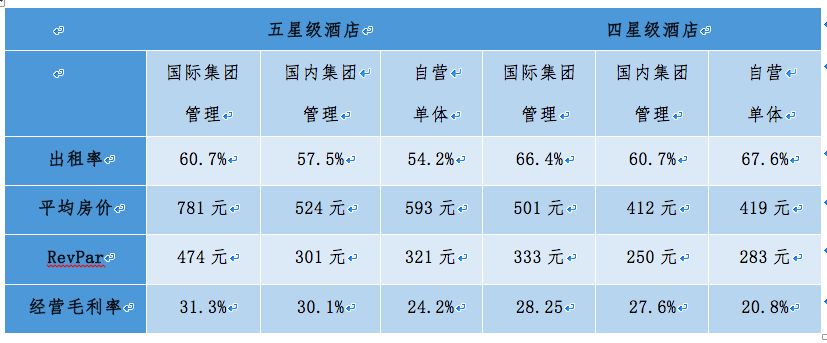 单体酒店虽然规模庞大,但是相比连锁酒店,整体经营状况还有一定的差距。李原曾经对2017年浩华管理顾问公司发布的相关数据进行了整理(见下图),对比自营及国际国内连锁四五星级酒店的数据发现,自营酒店的平均房价、RevPar和经营毛利率经营均不如国际集团管理酒店;与国内集团管理酒店相比,虽然平均房价和RevPar稍高,但经营毛利率却相对较低。