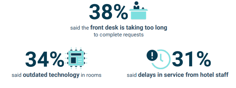另一方面,谈及酒店内最令其沮丧的体验,38%的旅客称在前台等待服务人员响应或解决问询方面耗费的时间过长;31%的旅客称酒店员工服务的延迟影响了其入住体验;还有34%的旅客认为客房技术十分过时。