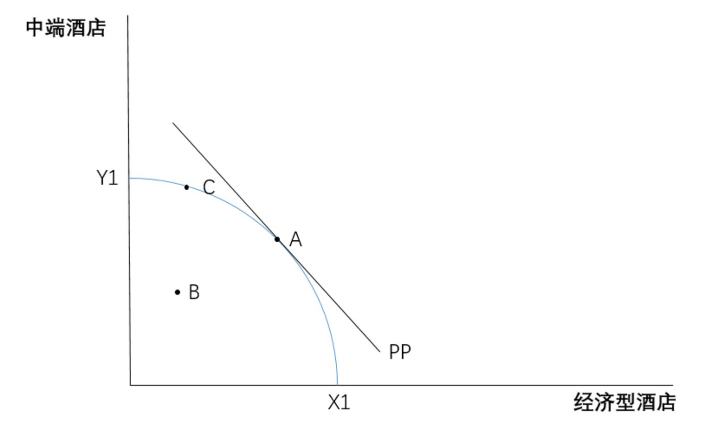 为了将问题简单化,我们现在假定酒店市场上只存在中端和经济型酒店两种产品,那么目前酒店市场的生产可行性边界是X1Y1,同时,这两种产品对部分消费者而言是可以相互替代的,于是需求函数PP呈现一条斜率为负的直线,但因为这种可替代性只对部分消费者成立,所以PP的两端并没有触及XY轴。