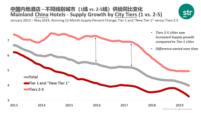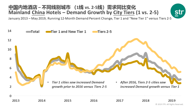 酒店供应只有与需求增速持平或略低于需求增速,才能取得持续性增长。而根据STR数据,高端酒店需求增长率的迅速下滑导致了入住率的下降。
