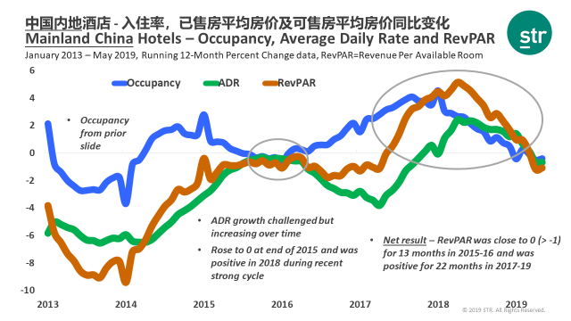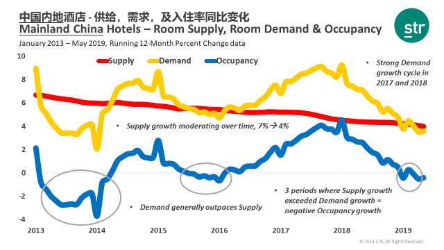 酒店数据分析公司STR分析2013年1月到2019年5月期间中国内地市场酒店供给、需求及入住率的变化数据时发现: