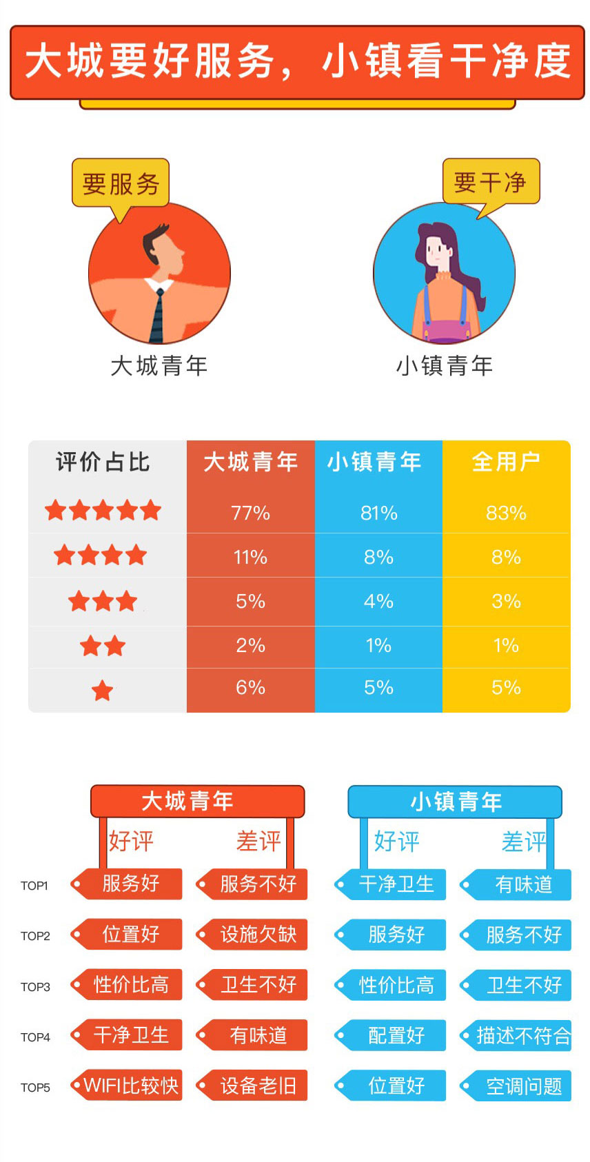 从对酒店品质的要求来看,小镇青年和大城青年也有明显区别:大城要好服务,小镇看干净度。从整体评分看,小镇青年在好评上更加慷慨。在评论内容中,其最高频的好评差评都与房间卫生有关,显示小镇青年对酒店的主要诉求仍然比较简单和基础。相对而言,大城青年则更看重酒店提供的综合服务。