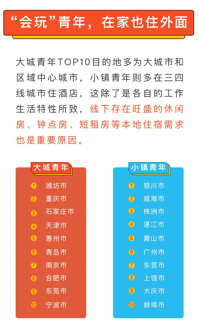 数据显示,最受大城市青年欢迎的目的地主要为一二线城市,小镇青年的热门目的地则集中在三四线城市。这一方面是两地年轻人工作生活特性所致,但更重要的是线下方兴未艾的本地酒店消费需求。