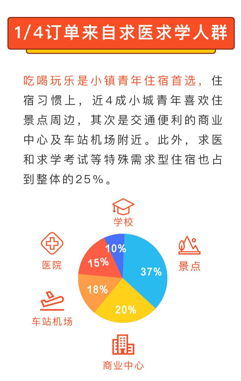 不只温暖出外打拼的游子,“OYO牌”短租房还为在外地求学、求医的小镇青年提供便利。据OYO研究院统计,在小镇青年的酒店订单中,求医、求学等特殊需求型住宿占到了整体的1/4。