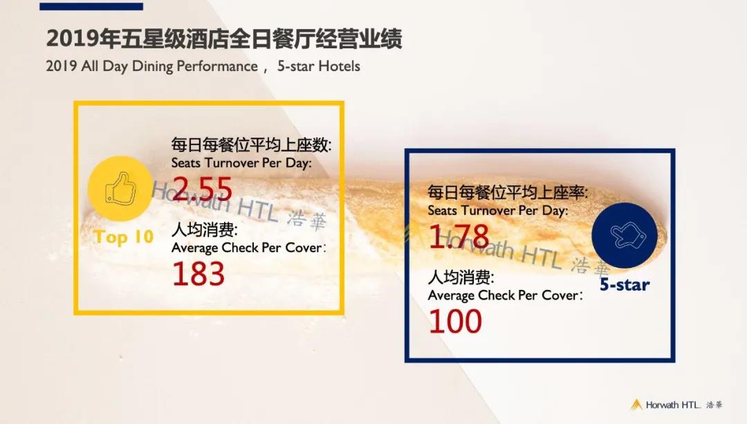 我们不难发现,全日制餐厅收入排名领先的酒店,大多位于一线城市或知名度假目的地的中心位置,品牌定位奢华或超高档。不可否认,餐位数量会较大程度影响全日制餐厅的总收入水平,但这绝非决定性条件。对比整体五星级酒店,排名前十的酒店无论上座数还是人均消费均明显更优。因此,全日制餐厅的业绩提升仍有较大想象空间:一方面,全日制餐厅能否避开早餐厅的刻板印象,深入挖掘午餐、晚餐对于消费者的吸引力,提升上座率;另一方面,全日制餐厅能否突破自助形式带来的消费瓶颈,从提升人均消费的角度拉动收入增长。