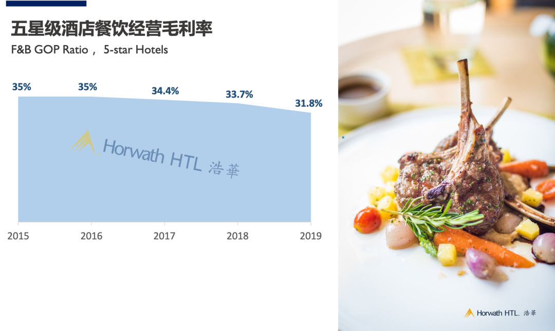 进一步观察五星级酒店的餐饮毛利率水平,在过去五年中,餐饮毛利甚至呈现了逐年下降的趋势。一方面,社会餐饮和外卖送餐的发展削弱了在消费者酒店用餐的必要性;另一方面酒店高标准化的餐饮运营模式带来的高昂人工成本,不断挤压酒店的餐饮毛利空间。整体而言,五星级酒店餐饮经营挑战愈发严峻。