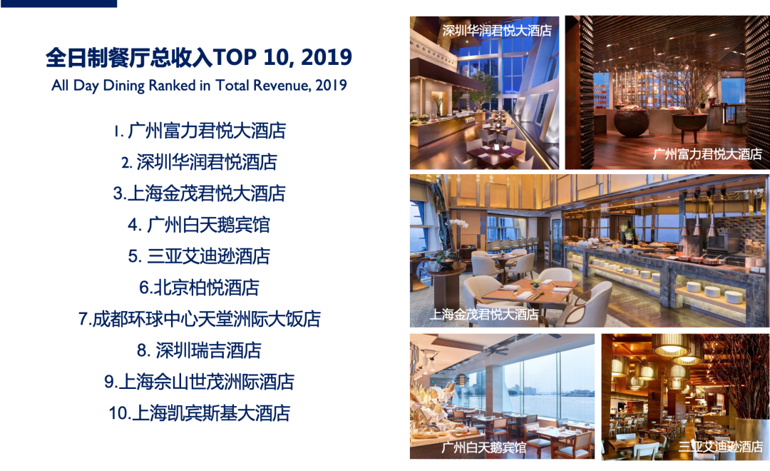 此外,在参与2019财年《中国饭店业务统计》的705家五星级酒店中,我们列举出全日制餐厅收入排名前十的酒店。