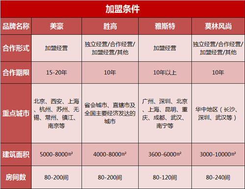 二、加盟条件VS:胜高莫林风尚都行,美豪雅斯特有点要求