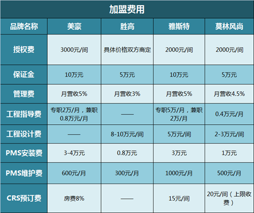 1) 品牌授权费用来看,美豪最高,达到3000元/间;雅斯特和莫林风尚只要2000元/间;胜高则没有具体标准,要具体协商,这是比较少见的现象。保证金方面,美豪和雅斯特都为10万元,胜高和莫林风尚仅需5万元,4大品牌的准入门槛较低。管理费方面,美豪和雅斯特为5%的月营收,莫林风尚为4.5%,胜高仅为3%。